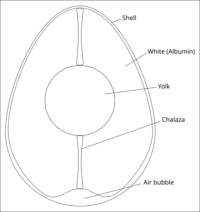 At first glance an egg seems pretty simple, a shell, a yellow bit and a white bit. The yellow bit is the yolk and the white is the albumin. Though the egg has a great deal of structure and sub-structure, for our purposes this is almost enough. For now we just want to note that the white has a sub-component called the chalazae (there are two chalaza) that anchor the yolk in the centre of the white. An egg also has an air bubble at it’s wide end and, because the shell is porous and lets out moisture, the egg will dry out slightly over time and this bubble will grow1.