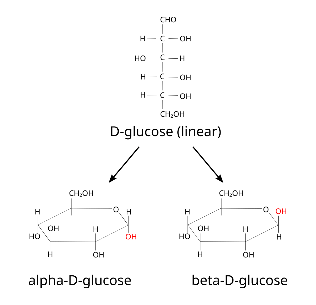 More complex carbohydrates are not generally called sugars but they are also important and we have come across some of them before. Oligosaccharides, combining three to ten monosaccharides, are often found attached to lipids or amino acids (the building blocks of proteins) and when attached to amino acids they are often the cause of Maillard reactions that make for a nice sear on a steak. Polysaccharides, any carbohydrate made from more than ten monosaccharides, are generally structural or storage molecules, one important example being starch which we have seen before as an important actor in the french fry story. Other important polysaccharides include glycogen, the primary energy storage molecule in humans, and cellulose, the major structural component of plant cell walls.