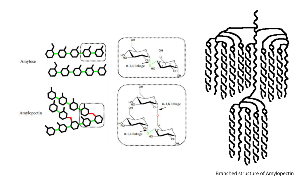 Starch is actually a mixture of two different types of carbohydrate: amylopectin and amylose. Amylose is a straight chain polysaccharide made up of between 500 and 5,000 glucose molecules linked together by glycosidic bonds (in the business known as alpha-1,4-glycosidic bonds). Amylopectin is also a polysaccharide made up of glucose molecules but, unlike amylose, the glucose molecules are occasionally bound by an alpha-1,6-glycosidic bond which gives amylopectin a branched structure. Amylopectin can contain between 500 and 20,000 glucose units with a branch occurring every 25-30 units which makes it a large and complicated molecule. Natural starches typically consist of 10-30% amylose and 70-90% amylopectin. Though some cultivated plant varieties can have starches composed of almost 100% amylopectin. Glutinous rice, for example, that is used to make Thai sticky rice has a starch almost completely made from amylopectin.